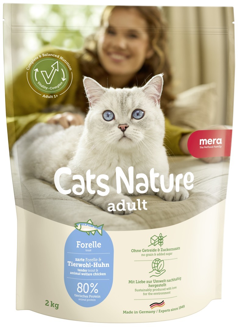 Samenstelling: Kipproteïne (gedroogd, o.a. 20% van diervriendelijke bedrijven), forelproteïne (14%, gedroogd), aardappelvlokken, erwten, gevogeltevet, aardappelzetmeel, gevogelteproteïnehydrolysaat, gedroogde bietenpulp, appeldroesem, lignocellulose (2,8%), biergist (gedroogd), zalmolie (1,1%), lijnzaad (1%), zonnebloemolie, minerale stoffen, cichorei-inuline (0,2%)
